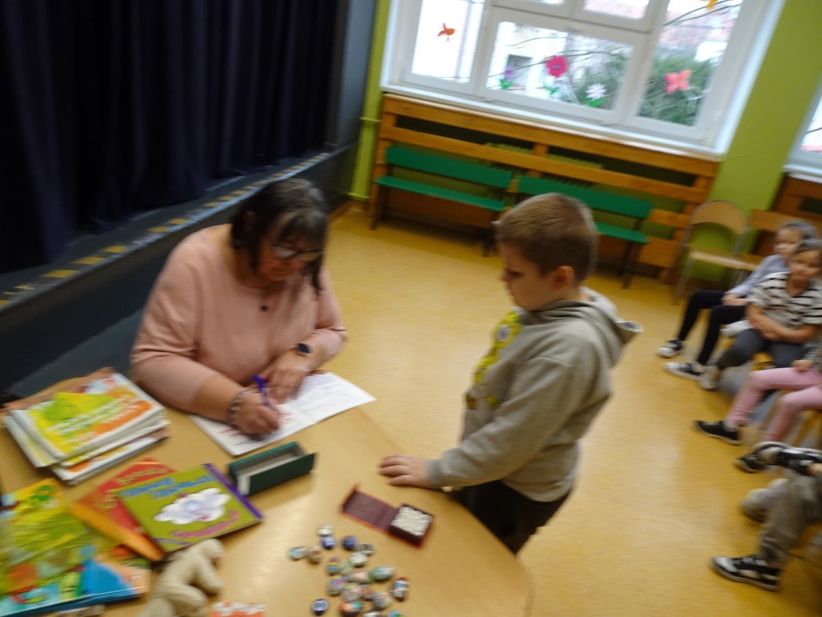 Dzieci miały także okazję aktywnie uczestniczyć w zajęciach – wspólnie tworzyli własne opowiadanie, wykorzystując do tego kolorowe kamienie. Było to twórcze i angażujące doświadczenie, które pokazało, że każdy może zostać małym pisarzem.