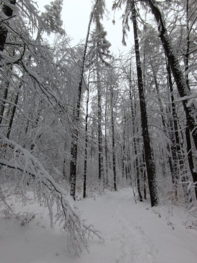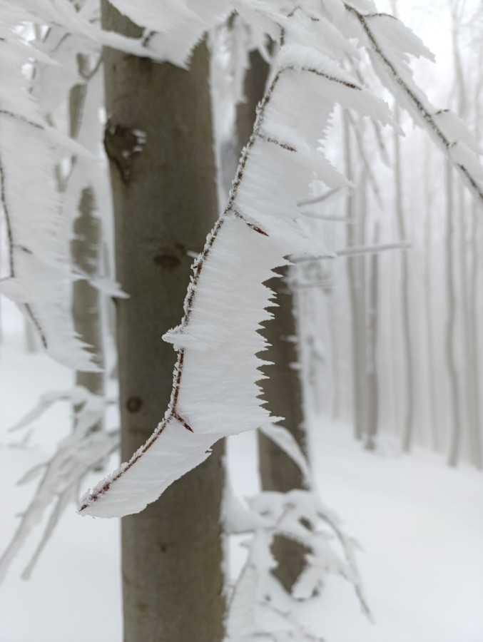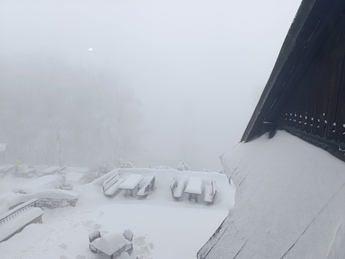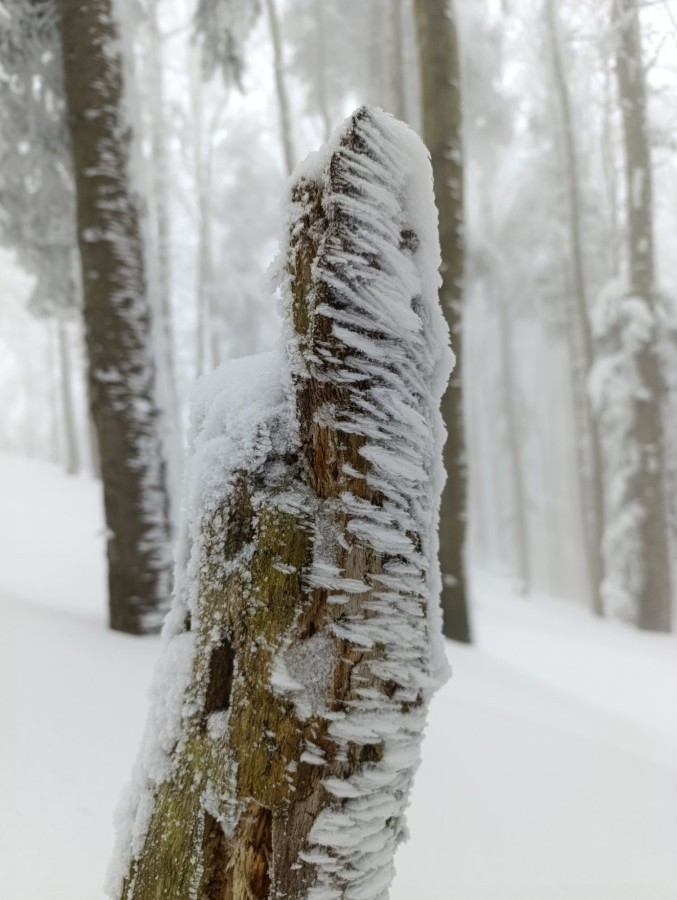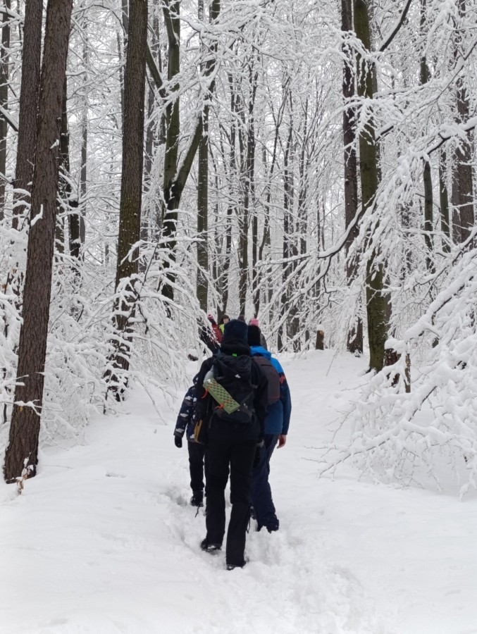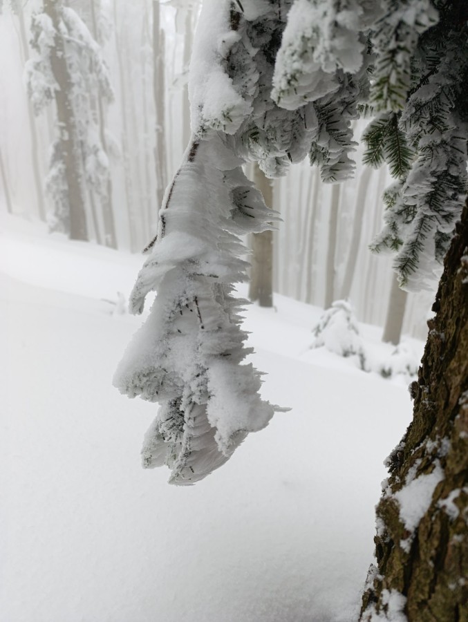 Zamiast zapowiadanej wiosny, przywitała nas prawdziwie zimowa aura. Gęsto padający śnieg w nocy pozostawił oszałamiający krajobraz, a oszronione drzewa i miękki puch pod nogami stworzyły scenerię rodem z „Opowieści z Narnii”. Las wyglądał jak zaczarowany – cichy, biały, niemal nierealny. Każdy krok w tej bajkowej przestrzeni był jak podróż do innego świata, a widoki wynagradzały wszelkie trudy podejścia.